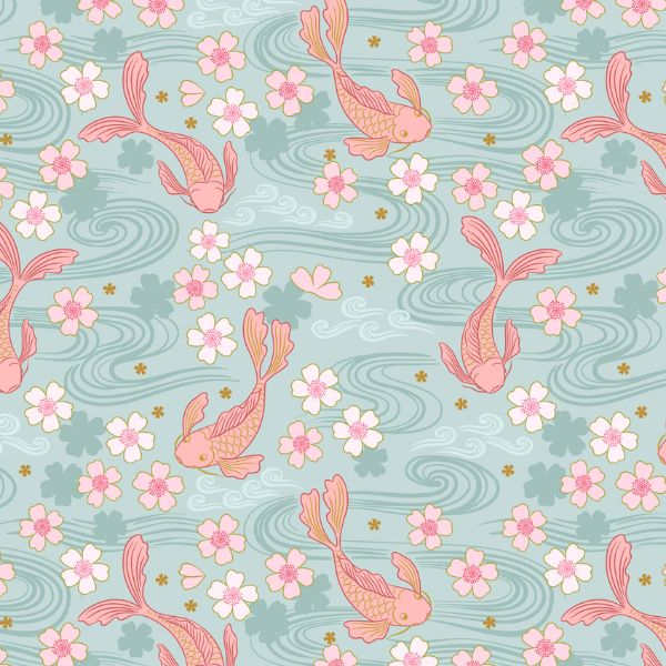 A919B Sakura Koi on Eau de Nil with Gold Metallic, Sakura by Lewis & Irene is a design of Koi swimming around pink flowers on a blue background.