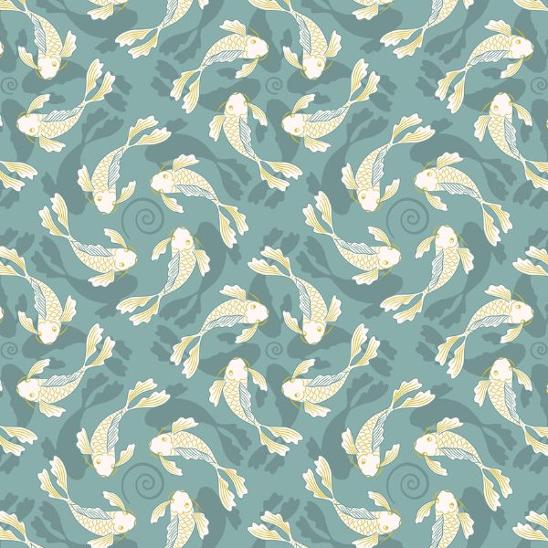 A922C Swimming Koi on Pond Blue with Gold Metallic, Sakura by Lewis & Irene