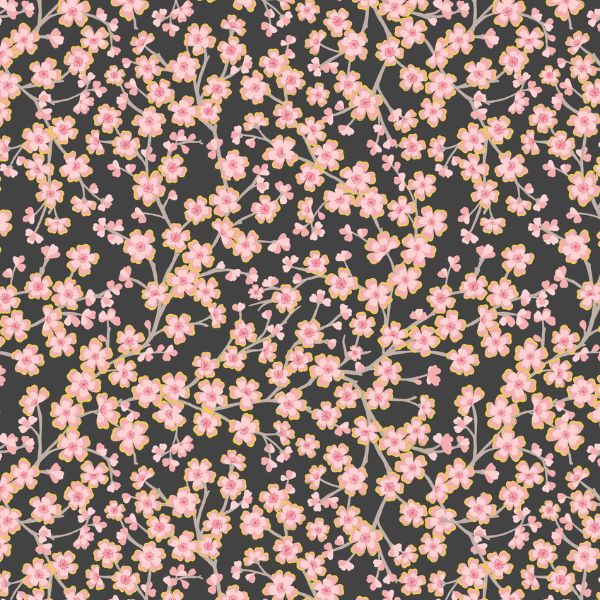 A923C Cherry Blossom on Charcoal with Gold Metallic, Sakura by Lewis & Irene is a design of pretty pink cherry blossom flowers on a charcoal background.