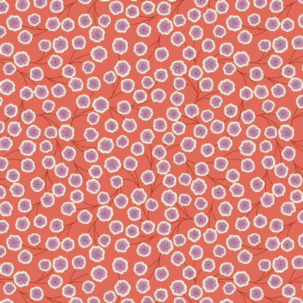 A927B Simple Flower Terracotta, Jardin d’Automne by Lewis & Irene features scattered plum-toned blossoms with cream outlines on a rich terracotta background. This playful yet elegant floral is perfect for seasonal quilts, warm toned home décor, and charming sewing projects.