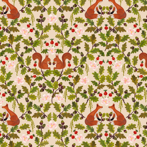 A936A Fox and Squirrel on Dark Cream, Old Quercus by Lewis & Irene