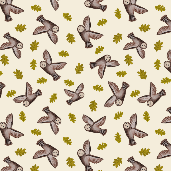 A938.Flying Owl on Dark Cream, Old Quercus by Lewis & Irene features majestic owls in mid-flight, soaring among scattered autumn leaves on a warm dark cream background, capturing the magic of woodland skies.