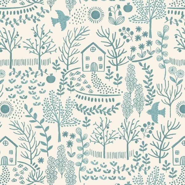 A940A Garden on Cream, Cosy Home by Lewis & Irene features a charming garden of flowers, trees, and birds in soft morning blues, scattered across a gentle cream background, capturing the calm and quiet rhythm of tending to plants at home.