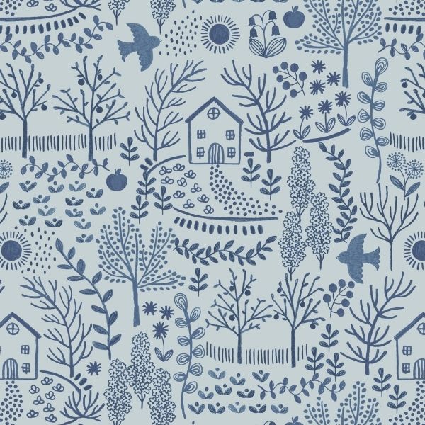 A940B Garden on Blue Cosy Home by Lewis & Irene features a charming garden of flowers, trees, and birds in dark blues, scattered across a gentle pale blue background, capturing the calm and quiet rhythm of tending to plants at home.