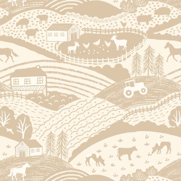 A955A Cream Croft, Country Croft by Lewis & Irene features a peaceful farmyard scene with chickens, geese, wheelbarrows, and wildflowers on a cream background capturing the simple charm of country life.