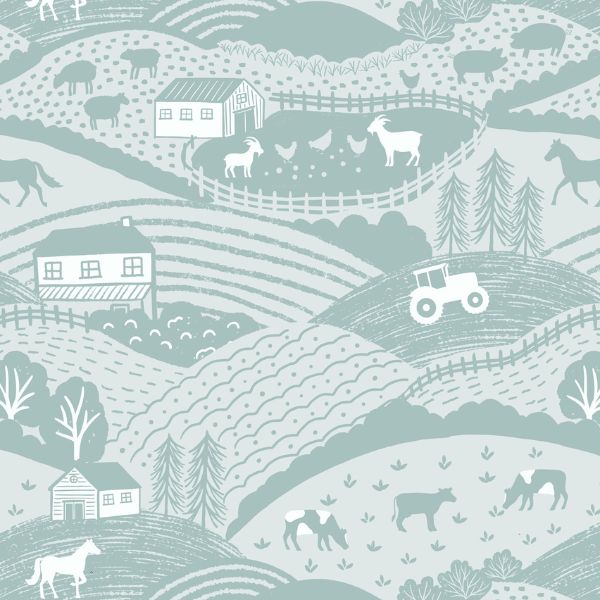 A955B Duck Egg Croft, Country Croft by Lewis & Irene features a peaceful farmyard scene with chickens, geese, wheelbarrows, and wildflowers on a gentle duck egg blue background capturing the simple charm of country life.