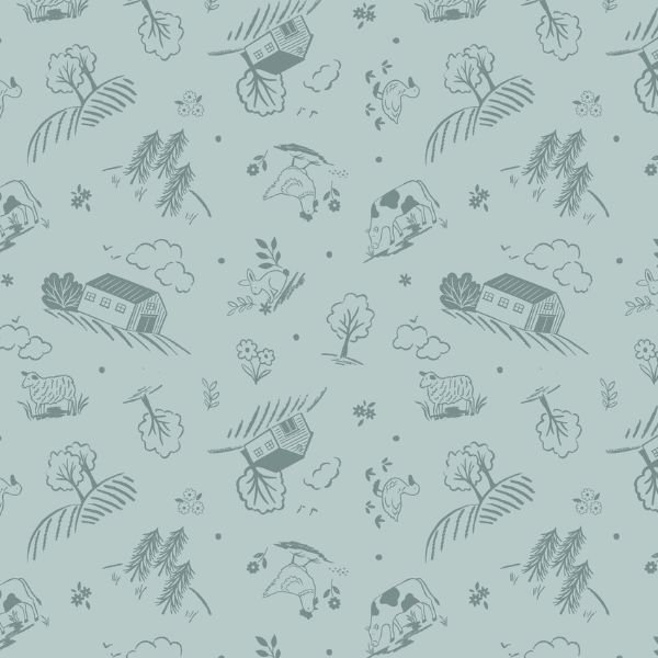A959B Country Croft on Duck Egg, Country Croft by Lewis & Irene features a scenic countryside design with cosy cottages, sheep, and trees scattered across a duck egg blue background capturing the peaceful essence of rural living in a gentle, storybook style.