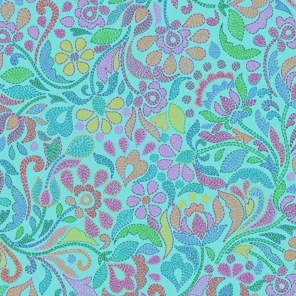 A980B Sambramha Stitches on Turquoise, Sambramha by John Scott is a beautiful colourful floral print made up of lines of stitching on a pale turquoise background.