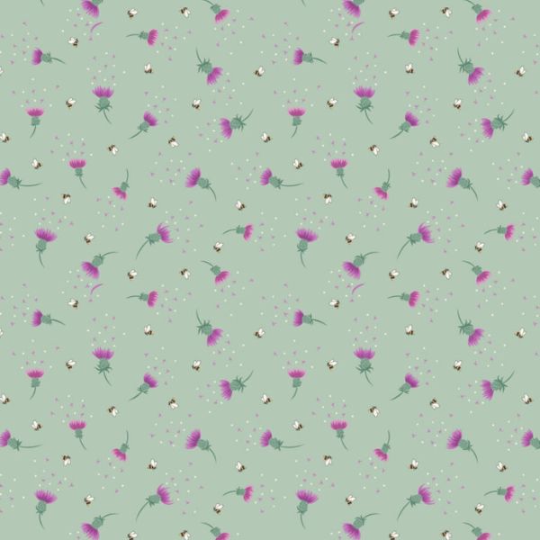 A988C Bee Thistle on Sage Green, A Celtic Summer by Lewis & Irene features a beautiful bee and thistle motif on a sage green background.