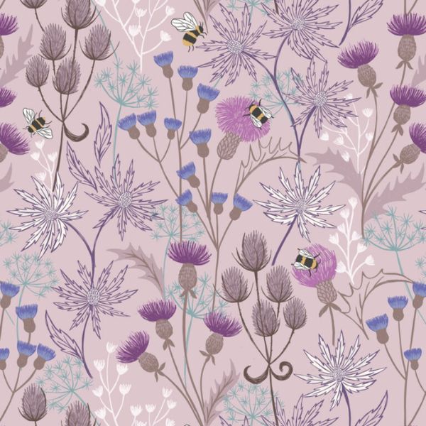 A991C Celtic Floral on Light Heather, A Celtic Summer by Lewis & Irene features a variety of flowers with bees on a light heather background.