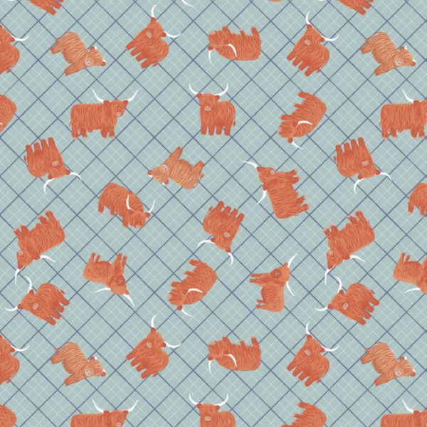 A992B Highlands Check Blue from A Celtic Summer embraces Lewis & Irene’s signature motif; the highland cow. This fun pattern consists of highland cows on a blue check background.