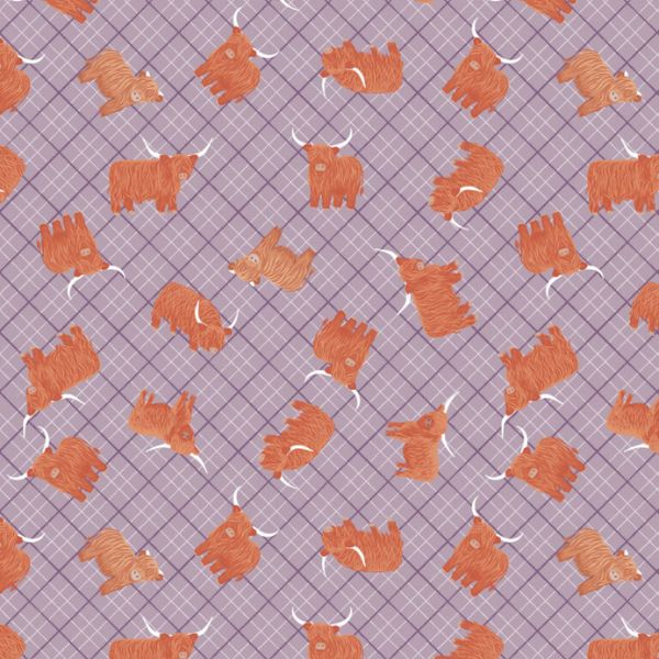 A992C Highlands Check Heather from A Celtic Summer embraces Lewis & Irene’s signature motif; the highland cow. This fun pattern consists of highland cows on a heather check background.