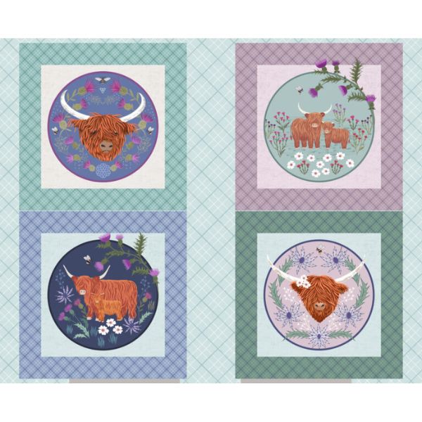 A993 Celtic Summer Yard Panel, A Celtic Summer by Lewis & Irene is a beautiful collection of highland cows. The panel is a mixture of portraits and families decorated with flowers on a colourful check background. This panel is perfect for cushion making.