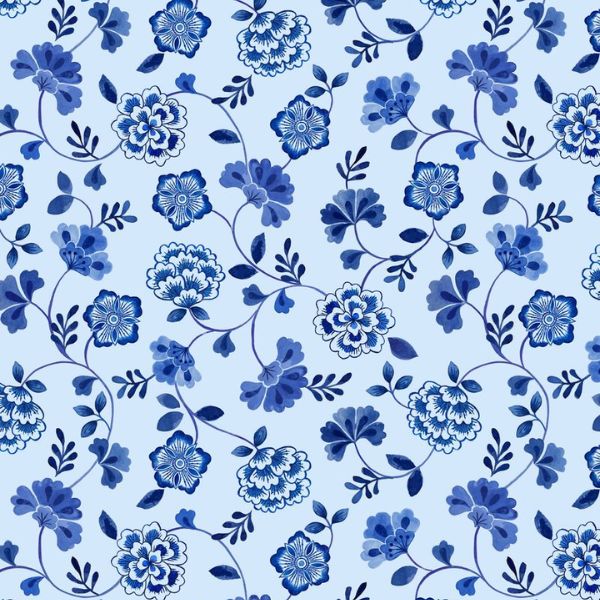 A996B Inky Florals Trails on Light Blue, Porcelain and Sea Glass by Stuart Hillard features an intricate pattern of beautiful blue flowers on a light blue background.