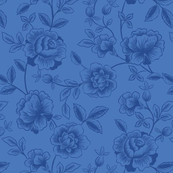 A997B Rose Trail on Mid Blue, Porcelain and Sea Glass by Stuart Hillard features a gorgeous pattern of light blue roses on a blue background.