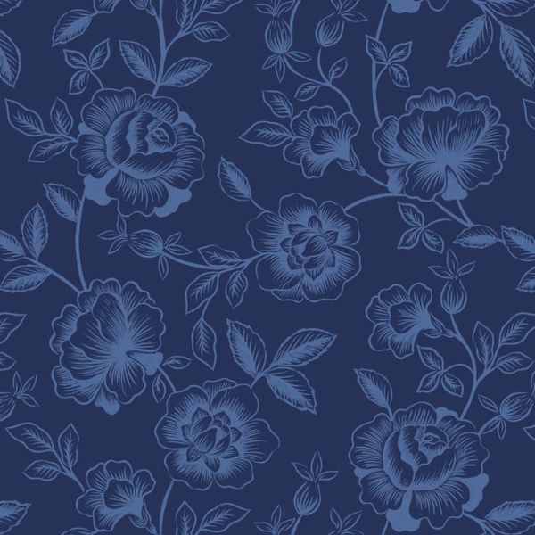 A997C Rose Trail on Dark Blue, Porcelain and Sea Glass by Stuart Hillard features a gorgeous pattern of light blue roses on a dark blue background.