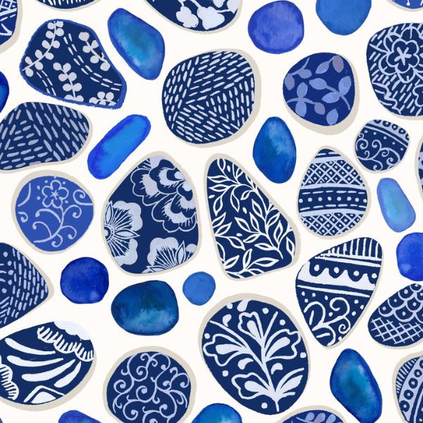 A998A Sea Glass and Pottery Fragments on Cream, Porcelain and Sea Glass by Stuart Hillard features a pattern of sea glass and painted pottery fragments on a cream background.