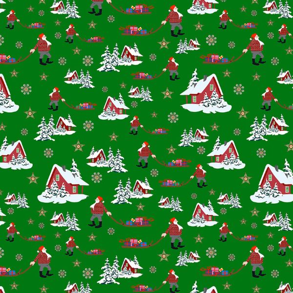 AC10B Christmas Eve on Green, Norwegian Christmas by Arne & Carlos for Lewis & Irene. This beautiful Christmas collection is inspired by a typical Norwegian celebration, which includes winter landscapes, fun in the snow, reindeer, traditional Christmas elves that live in barns and will bring gifts if they get a bowl of porridge on Christmas Eve. Houses are traditionally decorated with ornaments such as stars, hearts, pinecones and angels made out of straw and Poinsettias are also part of Christmas decorations.
