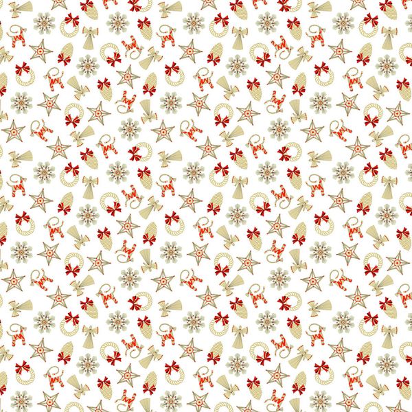 AC11A Straw Decorations Small on White, Norwegian Christmas by Arne & Carlos for Lewis & Irene. This beautiful Christmas collection is inspired by a typical Norwegian celebration, which includes winter landscapes, fun in the snow, reindeer, traditional Christmas elves that live in barns and will bring gifts if they get a bowl of porridge on Christmas Eve. Houses are traditionally decorated with ornaments such as stars, hearts, pinecones and angels made out of straw and Poinsettias are also part of Christmas decorations.
