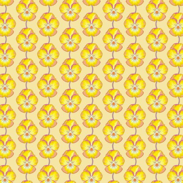 AMT124-52V Pansy Muted, Iconic by Anna Maria Textiles is a colourful bold print of yellow pansies on a soft yellow background.