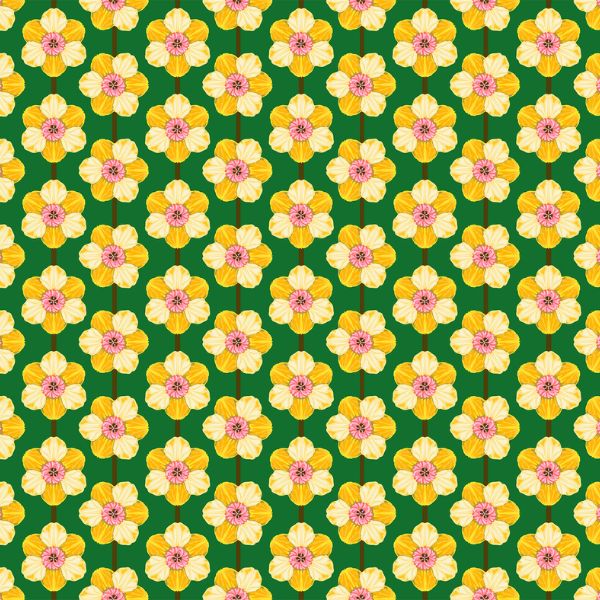AMT126-54L Daffodil Verdant, Iconic by Anna Maria Textiles is a colourful print of rows of yellow and pink daffodils on a green background.