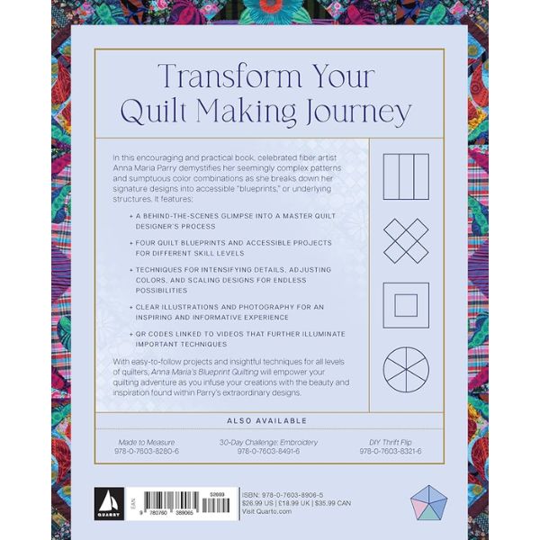 Uncover the mystery of quilt design with Anna Maria’s Blueprint Quilting. Celebrated fibre artist Anna Maria Parry demystifies her seemingly complex patterns and sumptuous colour combinations as she breaks down her signature designs into accessible “blueprints,” or underlying structures. This accessible, visually inspiring book features: