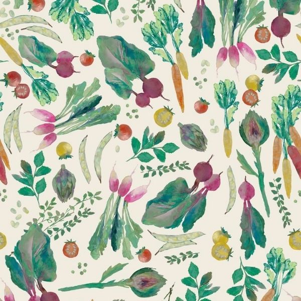 BG076 Vegetable Patch Ecru, Vegetable Patch by Bluebellgray features a charming design of carrots, tomatoes, radishes and peas on a cream background.