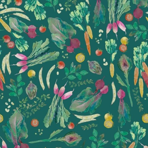 BG077 Vegetable Patch Teal, Vegetable Patch by Bluebellgray features a charming design of carrots, tomatoes, radishes and peas on a rich green background.