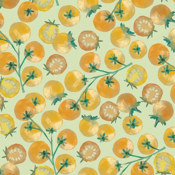 BG081 Vine Tomatoes Yellow, Vegetable Patch by Bluebellgray features a charming design of yellow tomatoes on the vine on a soft green background.