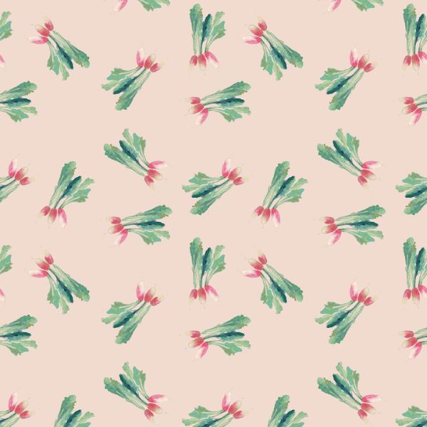BG082 Radish Red, Vegetable Patch by Bluebellgray features a charming design of bunches of radishes on a light peach background.
