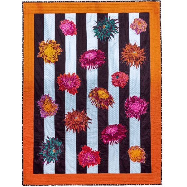 This bold Blooming Columns contrasting striped quilt with brilliant Japanese Chrysanthemum fabric blooms will require experience of machine appliqué techniques to achieve the best results. The background is made up of alternating strips, of dark and light. Fussy-cut flower patches are fused and machine embroidered onto the background and a simple contrasting border completes the quilt.