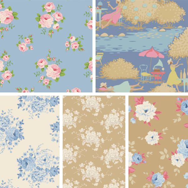 Blue and Sand Fat Quarter Pack contains 5 designs from the Sunday brunch collection in blues and browns.