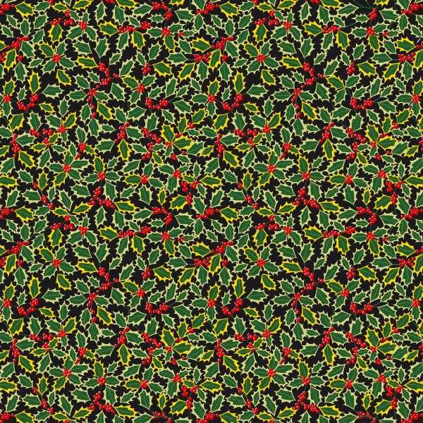 C103.3 Holly on Black with Gold Metallic by Lewis and Irene is a beautiful festive design featuring traditional Christmas florals. Ideal for patchwork and quilting projects.