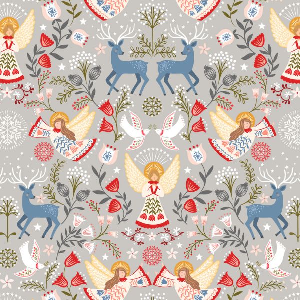 C108-2 Peace and Joy, Peace and Joy on Silver with Metallic Gold, Lewis & Irene. A festive fabric adorned with glorious floral angels with metallic gold highlights, on a silver coloured background.