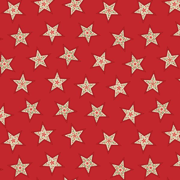 C110-3 Peace and Joy, Stars on Red, Lewis & Irene. A star fabric, with celestial floral stars, on a red coloured background.