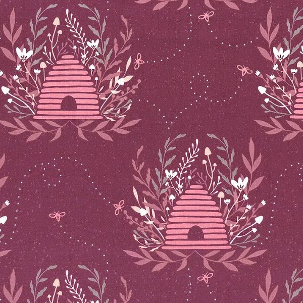 C11090 Grape Bee Hive features bee hives on a purple background. Harmony by Melissa Lee is a beautiful summer collection for Riley Blake designs. Get in touch with the latest buzz with this friendly collection of spring life. Bees, beehives, deer, leaves, and meadows full of blooming flowers in grape, honey, cream and other shades of yellow and purple.