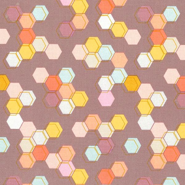 C11093 Grey Honeycomb features a hexagon print in summer colours on a grey background. Harmony by Melissa Lee is a beautiful summer collection for Riley Blake designs. Get in touch with the latest buzz with this friendly collection of spring life. Bees, beehives, deer, leaves, and meadows full of blooming flowers in grape, honey, cream and other shades of yellow and purple.