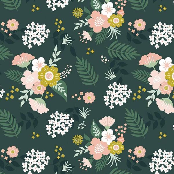 C11540 Hunter Main Floral is from the Hibiscus collection. Hibiscus by Simple Simon and company evokes those same dreamy feelings…and also gives us alpacas! The gorgeous palette of blush, citron, hunter, mint and white pairs perfectly with the florals, tropical foliage, ditzy, confetti and stripes. The darling alpacas add a bit of whimsy to this beautiful and fanciful collection.