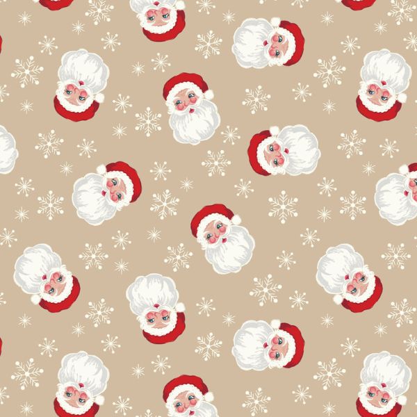 C118-1 Oh Christmas Tree! Santa on Natural with Pearl, Lewis & Irene. A festive fabric adorned with Santa, with pearl snowflakes, featured on a natural coloured background.