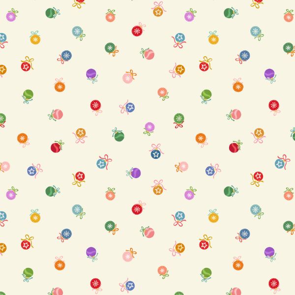 C119-1 Oh Christmas Tree! Baubles on Cream with Gold Metallic, Lewis & Irene. A festive fabric adorned with pretty coloured baubles, featured on a cream background.
