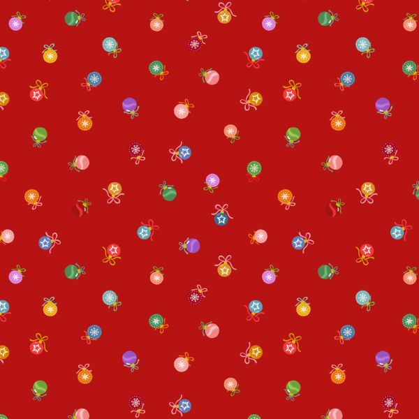 C119-3 Oh Christmas Tree! Baubles on Red with Gold Metallic, Lewis & Irene. A festive fabric adorned with pretty coloured baubles, featured on a red background.