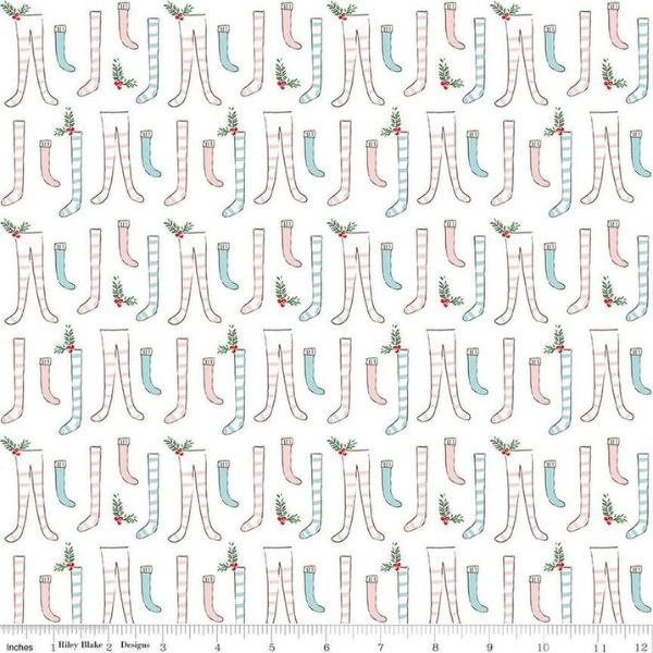 C12112 Stockings White, Pixie Noel 2 by Riley Blake is a design of Christmas stockings on a white background.