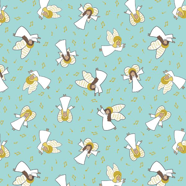 C123B Angels on Celestial Blue, Away in a Manger by Lewis & Irene features angels and music notes on a blue background.