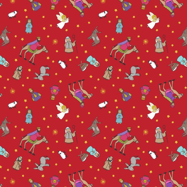 C125B Nativity Characters on Red, Away in a Manger by Lewis & Irene features characters from the nativity scene on a red background.