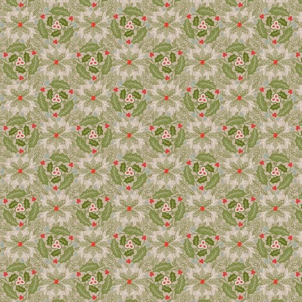 C133B Festive Celtic Leaves Green, Celtic Christmas by Lewis & Irene is featuring a green toned holly and leaf design with subtle Celtic swirls and pops of festive red perfect for elegant Christmas quilts and seasonal sewing.