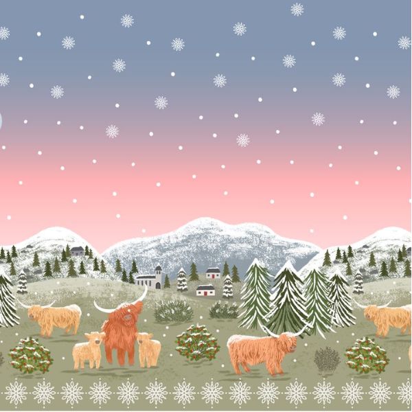 C137 Double Edge Border Panel, Celtic Christmas by Lewis & Irene is featuring a mirrored charming print of highland cows in front of a village and mountains under a snowing sunset sky.