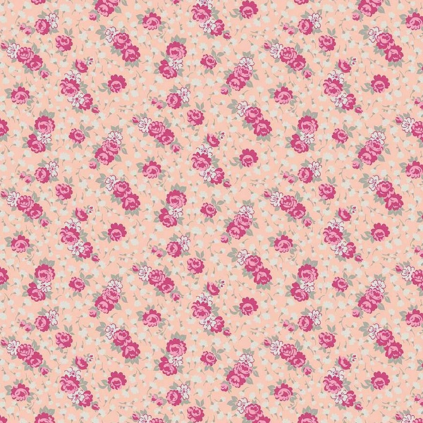 C15832 Roses Coral Precious Petites by Gerri Robinson of Planted Seed Designs for Riley Blake Designs. This print features clusters of roses and stems of flowers on a coral background.