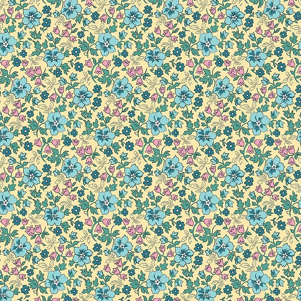 C15834 Garden Yellow Precious Petites by Gerri Robinson of Planted Seed Designs for Riley Blake Designs. This print features clusters of flowers and dotted leaves on a yellow background.