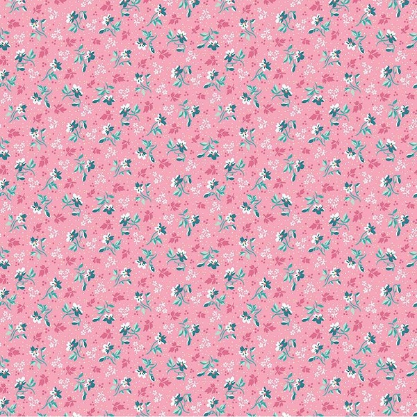 C15835 Flowers Pink Precious Petites by Gerri Robinson of Planted Seed Designs for Riley Blake Designs. This print features sprigs of flowers and pin dots on a pink background.