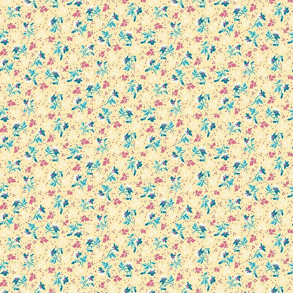 C15835 Flowers Yellow Precious Petites by Gerri Robinson of Planted Seed Designs for Riley Blake Designs. This print features sprigs of flowers and pin dots on a yellow background.